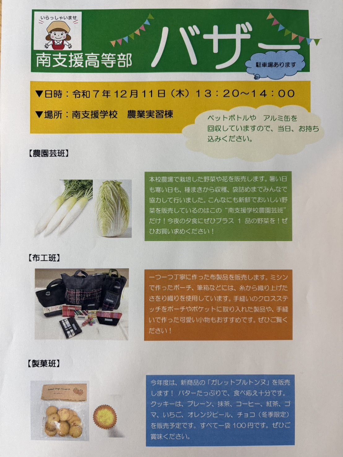 大月の友人が支援している“南支援学校”のバザーが明日12月11日(木)に開催されます。